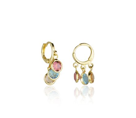 Brinco argolinha com pedras penduradas (rosa, azul e pêssego), banhado a ouro 18k.