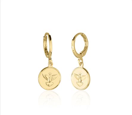 Brinco argolinha com medalha Espírito Santo pendurada, banhado a ouro 18k.
